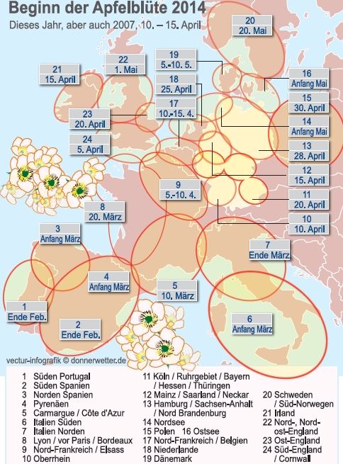 Als das wichtigste Signal des fortgeschrittenen Frühlings gilt die Apfelbaumblüte. Unsere Karte zeigt den Weg der Apfelbaumblüte aus Portugal bis Deutschland im Jahr 2014, mit dem durchschnittlichen Blühdatum. In den nächsten Wochen wandert die Blüte durch unser Land und erreicht im Mai Skandinavien und das Baltikum.
