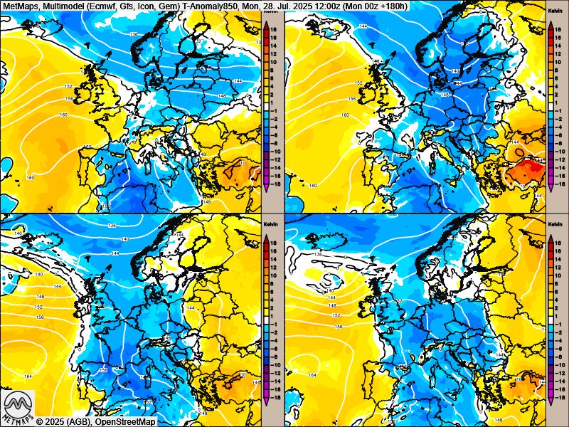 Zur Einordnung haben wir für Euch aktuelle Multimodellkarten mit den Temperaturabweichungen in Europa für Freitag und Montag vorbereitet. Und was sieht man? Extreme Hitze in Deutschland zumindest nicht.
