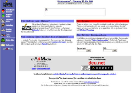 1996 - So sah donnerwetter.de zum Start aus. Deutschlandwetter, Straßenzustand, Reisewetter und die Schneehöhen. Damit war donnerwetter.de schon eine der ausführlichste Wetterseiten des Internets! Das Logo sah auch noch ein bißchen anders aus...