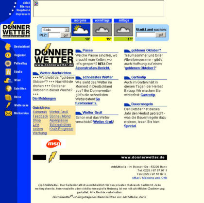 Auf der Homepage standen die Neuerungen sowie Aktionen - ein Prinzip, das wir bis heute beibehalten haben. Die Verbindung Wetter und Webcam-Links gab's auch zuerst bei uns. Und: Wir hatten den ersten Wetter-Newsletter mit der täglichen Vorhersage in Deutschland! Auch das Straßenwetter war vorher im Internet weitgehend unbekannt, ist nun aber auf fast jeder Wetterseite zu finden. Naja, aber wir fanden sogar den Aufbau unseres Feedback-Formulars kurz darauf bei einem Mitbewerber wieder... ;-)