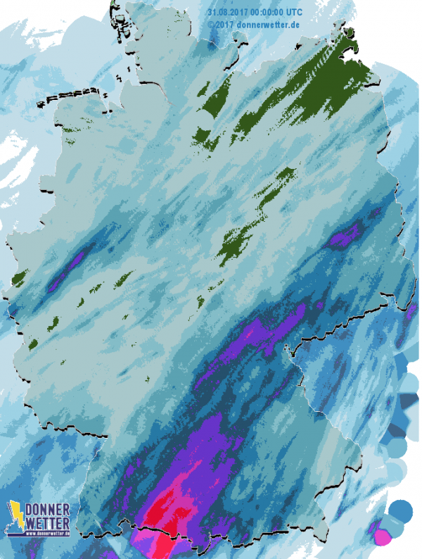 Heute und am Samstag muss ganz im Süden mit kräftigen Regenfällen und örtlichen Überschwemmungen gerechnet werden. Stellenweise können an beiden Tagen zwischen 25 und 50 Liter Niederschlag pro Quadratmeter fallen. Sonst treten gebietsweise Schauer auf, in der Größenordnung von etwa 5 bis 10 Liter pro Quadratmeter.
