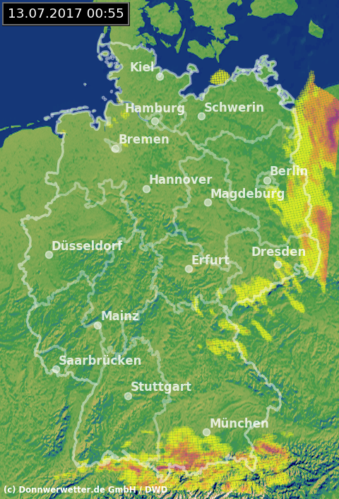 Das Radarbild zeigt aktuell nach Polen und Tschechien abziehende Regensignale. Auch an den Alpen stauen sich noch einige Regenwolken. Vor allem im Westen ist der Himmel oft sternenklar.