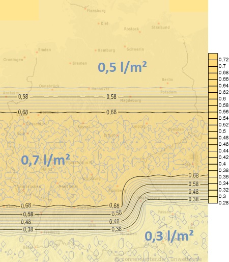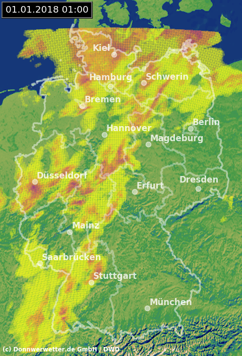 In der ersten Woche des Jahres 2018 überqueren uns von Westen weitere Schlechtwettergebiete im Wechsel mit kurzen Pausen. In etwas kälteren Abschnitten kann es im Bergland schneien, sonst fällt Regen. Außerdem drohen zwischendurch Sturmböen. Die Niederschlagsmengen liegen dabei pro Tag meist zwischen 5 und 20 Liter pro Quadratmeter, regional auch mehr. In Folgedessen werden die Pegelstände der Flüsse kontinuierlich weiter steigen.