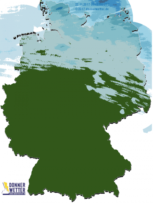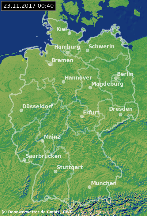 Das Radarbild zeigt aktuell keine Niederschlagssignale. Der Himmel über Deutschland ist nahezu überall im Lande sternenklar oder nur leicht bewölkt. Stellenweise haben sich im Süden Nebelfelder gebildet. Die Temperaturen liegen aktuell zwischen frostigen -3 Grad am Münchner Flughafen und milden 12 Grad in Werl und Paderborn/Lippstadt.