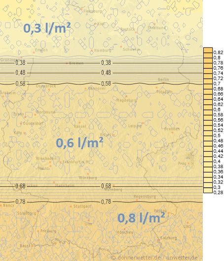 Bis zum Wochenende kann es regional zu Regen oder Sprühregen kommen, die Mengen liegen dabei jedoch meistens unter 7 Liter pro Quadratmeter. Sonst bleibt es trocken.