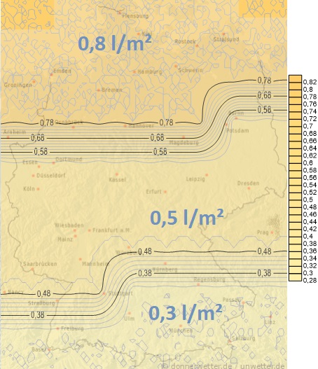 Heute entwickeln sich mit sonniger Einstrahlung wieder örtliche Schauerwolken, vereinzelt auch mit Blitz und Donner. Die Niederschlagsmengen liegen dabei meist zwischen 1 und 10 Liter pro Quadratmeter. Trocken bleibt es vermutlich im Nordosten.
