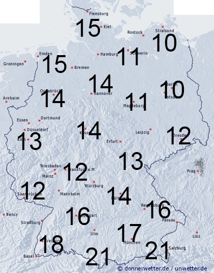 In Deutschland kommt es immer wieder zu teils schauerartigen Niederschlägen, die oberhalb von 400 bis 700 m auch in Schnee übergehen können. Sonst entsteht Benetzung durch Tau- oder Reifbildung. Die Benetzungsdauer liegt allgemein zwischen 10 und 16 Stunden, wobei es in Gebieten des Nordostens auch längere Zeit niederschlagsfrei bleiben kann. Dafür werden im Alpenvorland 17 bis 21 Stunden erreicht.