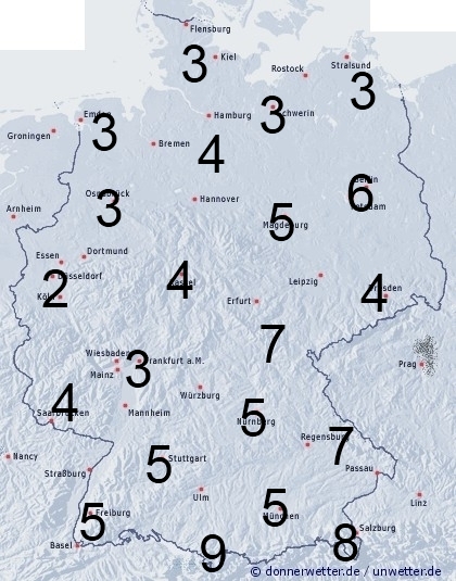 In der Südosthälfe unseres Landes ist mit örtlichen Schauern und Gewittern zu rechnen. Sonst entsteht leichte Benetzung durch nächtlichen Strahlungstau. Die Benetzungsdauer liegt allgemein zwischen 2 und 5 Stunden, bei auftretenden Gewittergüssen auch zwischen 5 und 9 Stunden.