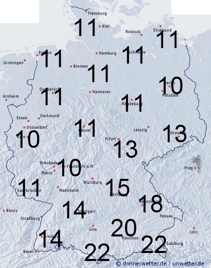Im Südosten des Landes regnet es noch längere Zeit, daher ist hier die Benetzungsdauer mit 13 bis 22 Stunden auch am höchsten. Sonst entsteht Benetzung durch Nebelnässe oder Tau. Die Benetzungszeit beträgt dabei allgemein zwischen 10 und 12 Stunden, kann jedoch außerhalb von Ortschaften in geschützten Lagen noch deutlich nach oben abweichen.