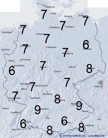 Eine schmale Regenzone zieht von der Mitte in den Süden und löst sich noch vor den Alpen auf. Sonst entsteht Benetzung durch Feuchtigkeit wie Tauansatz. Die Benetzungsdauer liegt in Deutschland allgemein zwischen 6 und 9 Stunden. Bei einer vorhandenen Schneedecke in den Bergen können bis 24 Stunden erreicht werden.