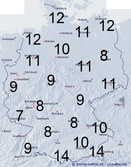 In der einströmenden kühlen Luft fällt in Deutschland gelegentlich Regen oder es treten teils kräftige Schauer auf. Die Benetzungsdauer ist dabei recht unterschiedlich und reicht allgemein von 7 bis 14 Stunden.