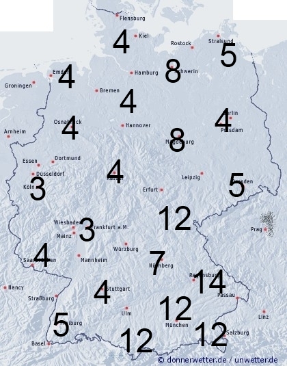 Von der Ostsee, über Sachsen-Anhalt bis nach Bayern regnet es noch längere Zeit. Die Benetzungsdauer erreicht hier zwischen 7 und 14 Stunden. Sonst entsteht Benetzung von meist 3 bis 5 Stunden vorwiegend durch nächtlichen Strahlungstau.