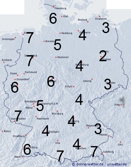 In Deutschland muss gebietsweise mit Regenschauern gerechnet werden. Die Benetzungsdauer liegt dabei allgemein zwischen 2 und 7 Stunden, wobei die Schauer im Osten seltener auftreten.