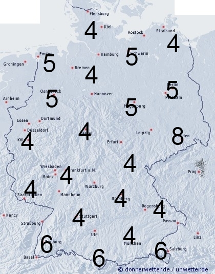 In der Westhälfte kann es im Tagesverlauf vereinzelt zu Schauern kommen, in den Nordosten zieht zum Abend vermutlich Regen aus Polen herein. Sonst sorgt nächtlicher Strahlungstau für Benetzung. Die Benetzungsdauer liegt in Deutschland allgemein zwischen 4 und 8 Stunden, kann aber außerhalb von Ortschaften deutlich nach oben abweichen.
