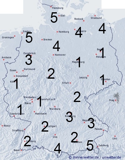 Im Nordwesten zieht gelegentlich Regen übers Land mit einer Benetzungsdauer von 3 bis 5 Stunden. Vor allem im Süden muss mit örtlichen Schauern und Gewittern gerechnet werden, mit einer Benetzungszeit von 2 bis 5 Stunden. Sonst bleiben Schauer eher die Ausnahme und leichte Benetzung entsteht durch nächtlichen Strahlungstau.