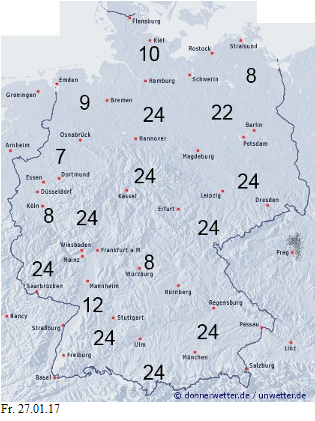 Die Benetzungsdauer liegt bei einer Schneedecke und im Nebel bei 24 Stunden. Sonst sind es gebietsweise unter zehn Stunden.