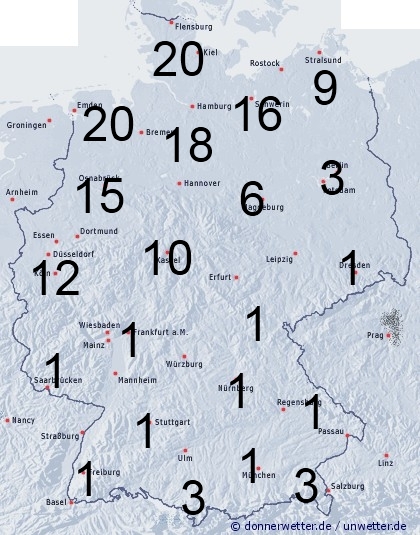Im Nordwesten und Norden fällt zum Teil länger anhaltender Regen mit einer Benetzungsdauer von 9 bis 20 Stunden. Nach Süden nimmt die Benetzung rasch ab, da es hier den ganzen Tag trocken bleibt.