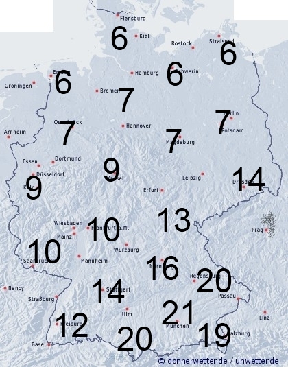 Heute ist es gegenüber gestern umgekehrt. Im Norden kommt es zu Schauern, im Süden zu teils länger andauernden Regenfällen. Während im Norden die Benetzungsdauer meistens zwischen 6 und 9 Stunden liegt, steigt sie in der Südhälfte auf über 10 Stunden an. In Bayern können teilweise über 20 Stunden erreicht werden.