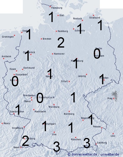 In Deutschland ist es freundlich und sommerlich. Leichte Benetzung entsteht nur durch nächtlichen Strahlungstau. Erst zum späten Abend können in Schwarzwaldnähe wieder erste Gewitter auftreten.