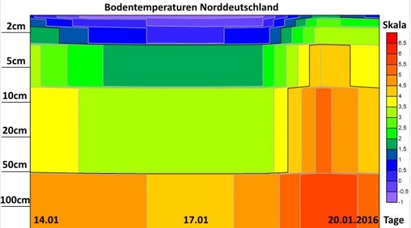 Bodentemperaturen vom 28.12.2015 bis zum 03.01.2016, für den Norden Deutschlands.