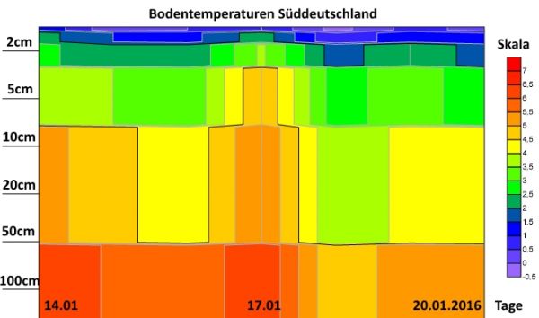Bodentemperaturen vom 28.12.2015 bis zum 03.01.2016, für den Süden Deutschlands.