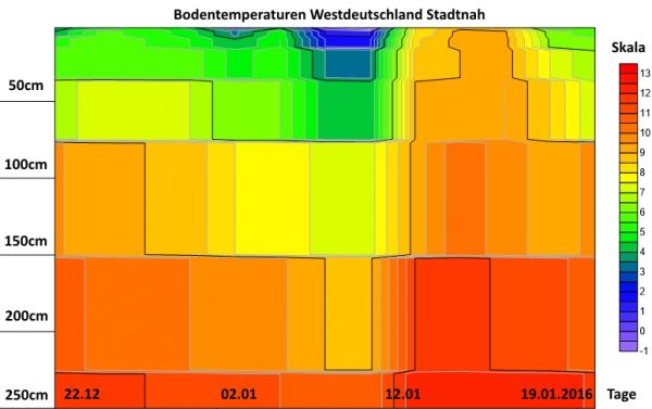 Bodentemperaturen vom 14.12.2015 bis zum 12.01.2016, für den Westen Deutschlands.