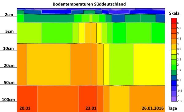 Bodentemperatruen vom 20.01.2016 bis zum 26.01.2016 für das Mittelgebirge.