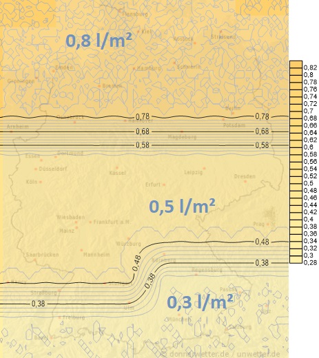 Heute tagsüber fällt vor allem im Norden und Osten etwas Regen oder Sprühregen, im Bayrischen-Wald kann es in höheren Lagen auch etwas schneien. Die Niederschlagsmengen liegen meistens unter 5 Liter pro Quadratmeter.