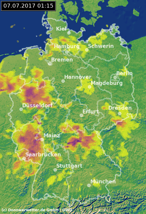 Das Radarbild zeigt aktuell im Westen und in der Mitte gebietsweise kräftige Gewittersignale, die langsam nach Osten ziehen. Im Nordosten und Südosten ist der Himmel teils noch sternenklar.