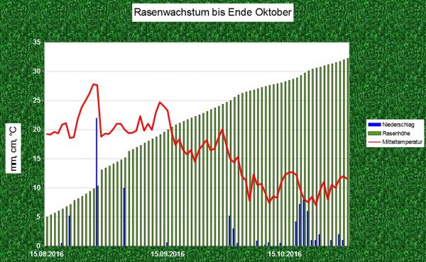 Angenommen der letzte Schnitt erfolgte am 15. August diesen Jahres, also vor 9 Wochen, dann ist die Wiese seitdem wieder um etwas mehr als 25 cm gewachsen. Während im Spätsommer vor allem die große Trockenheit den Pflanzen zu schaffen machte, bremsen nun im Herbst vor allem die fallenden Temperaturen das Wachstum im Grünland aus.
