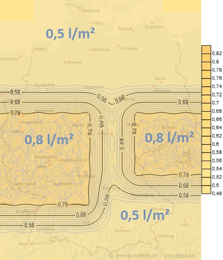 Heute regnet oder nieselt es vor allem in der Südwesthälfte. Dabei sind Mengen zwischen 5 bis 10 Liter pro Quadratmeter zu erwarten.
