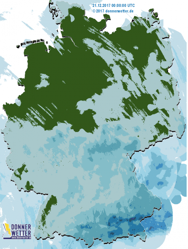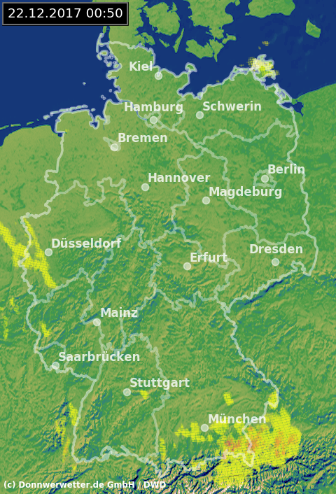 Das Radarbild zeigt aktuell vor allem in Südbayern einige Signale mit leichtem Regen und Sprühregen. Sonst ist der Himmel über Deutschland meistens wolkenverhangen, nur über Thüringen und dem südlichen Sachsen-Anhalt zeigen sich einige Sterne. Gebietsweise hält sich dichter Nebel.