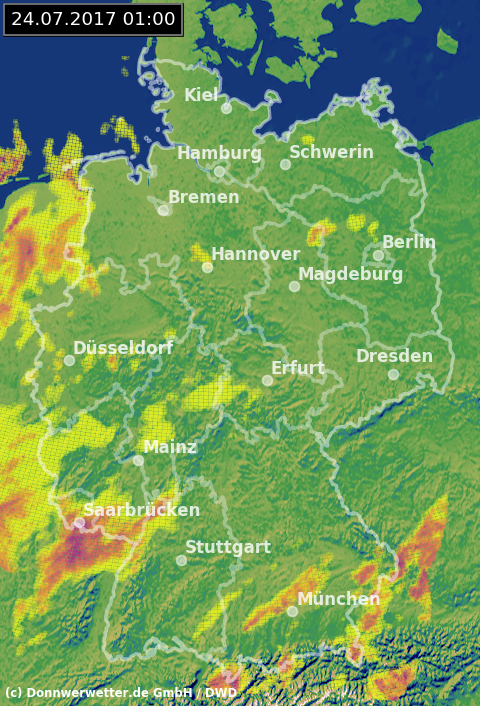 Das Radarbild zeigt aktuell vor allem über Südbayern noch einige kräftigere Schauersignale. Möglicherweise könnten aus den Alpen heraus auch noch einzelne Gewitterzellen nachfolgen. Sonst erreichen von Frankreich und Benelux neue teils stärkere Regensignale den Westen.
