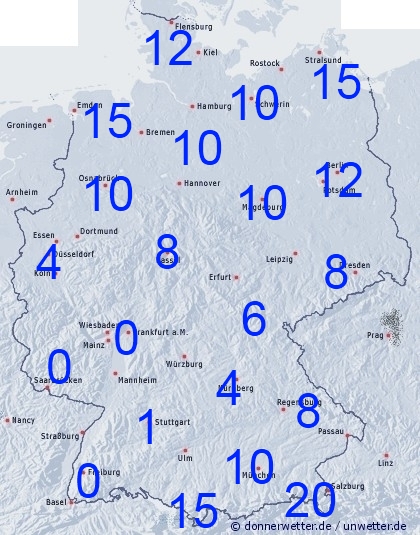 Die Trockenperiode im Norden unseres Landes wird unterbrochen. Bei den bis Montag 00 UTC zu erwartenden Niederschlagsmengen sind hier 10 bis 15 Liter pro Quadratmeter, örtlich auch mehr möglich. Wegen der seit Frühjahrsbeginn andauernden Trockenheit dürfte dies vorläufig aber nur der berühmte Tropfen auf den heißen Stein sein. Sonst liegen die Mengen jedoch in der Regel unter 10 Liter pro Quadratmeter. Lediglich am Alpenrand können staubedingt höhere Werte angestrebt werden. Meist trockenen Hauptes davon kommt der Südwesten. Hier fällt in den nächsten Tagen voraussichtlich bis auf wenige Ausnahmen kaum ein Tropfen Regen.