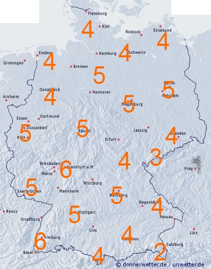 Bei der täglichen potentiellen Verdunstung liegen wegen der sommerlichen Witterung die Mengen heute und wohl auch in den nächsten Tagen landesweit zwischen 4 und 6 Liter pro Quadratmeter, bei dichterer Bewölkung und auftretenden Regengüsse im Südosten, sowie im Erzgebirge werden meist nur zwischen 2 und 3 Liter pro Quadratmeter erreicht.