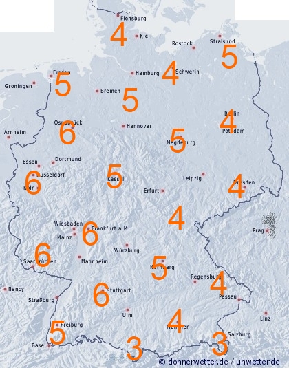 Bei den bis Freitag 00 UTC zu erwartenden Niederschlagsmengen geht der Norden meistens wieder leer aus. In der Südhälfte hingegen entladen sich teils kräftige Regengüsse und Gewitter. Die Mengen können auf engstem Raum wieder sehr unterschiedlich ausfallen und von den in der Karte eingetragenen gemittelten Werte noch deutlich nach oben abweichen. Örtlich sind über 50 Liter pro Quadratmeter zu erwarten.