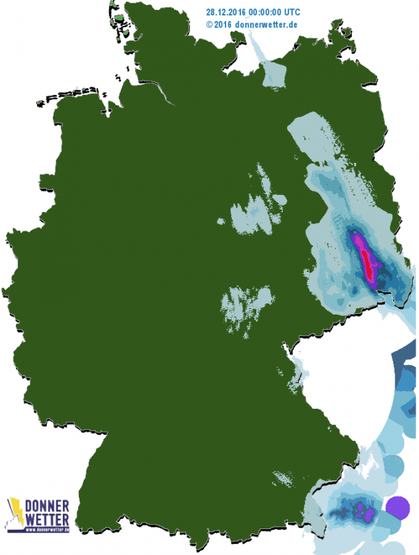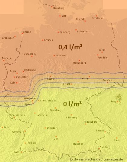 Fast überall war es trocken, nur in einem Streifen von der Ostsee bis zum Erzgebirge fiel etwas Regen. Besonders in Sachsen gab es lokal in einem eng begrenztem Gebiet bis zu 20 l/m2. Heute ist es überall trocken.