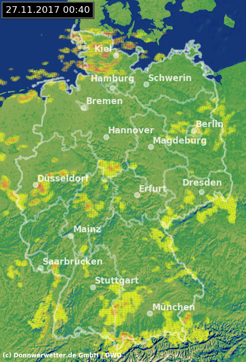 Heute dringt mit stark auffrischendem Wind von der Nordsee her neuer Regen bis ins Landesinnere vor. Die Schneefallgrenze steigt vorübergehend bis in die Gipfellagen der Mittelgebirge. Die Niederschlagsmengen erreichen meistens zwischen 5 und 20 Liter pro Quadratmeter. Im Süden bleibt es tagsüber zunächst eher trocken.