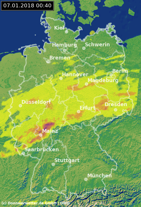 Das Radarbild zeigt aktuell die quer über der Mitte liegende Niederschlagszone mit einigen mäßigen und vereinzelt stärkeren Signalen. In den Frühstunden kann der Regen im nördlichen Bereich dieser Zone auch gebietsweise in Schnee übergehen. Sonst ist der Himmel über Deutschland oft noch wolkenverhangen, vor allem über Schleswig-Holstein zeigen sich aber auch die Sterne. Im Süden haben sich zum Teil dichte Nebelfelder gebildet.
