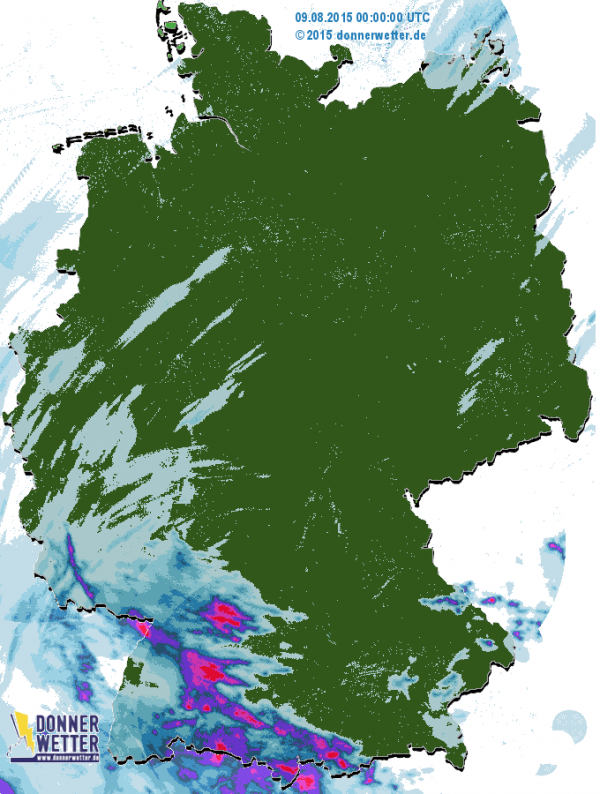 In Süddeutschland sind die Schauer und Gewitter über Bayern und Baden-Württemberg im 24 Stunden Regenradarauswertung gut zu sehen. Lokal fielen 30-40 l/m2.