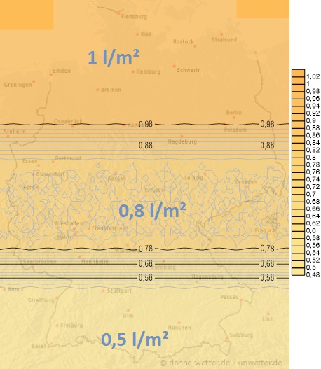 In der Nacht auf Dienstag werden die Mitte und der Süden von einer umfangreicheren Regenzone erfasst. Dabei können gebietsweise zwischen 10 und 30 Liter Regen pro Quadratmeter nieder prasseln. Auch im Küstenbereich können kräftigere Schauer auftreten.