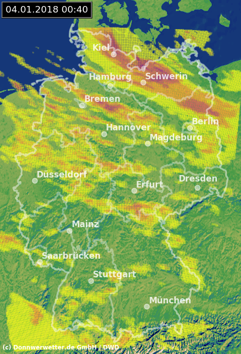 Das Radarbild zeigt aktuell vor allem in der Nordhälfte zum Teil stärkere Signale mit Regen. Aber auch in den Südwesten werden im Laufe der Nacht von Frankreich neue Regenfälle aufziehen. Sonst ist der Himmel über Deutschland meistens wolkenverhangen und nur stellenweise zeigen sich einige Sterne.