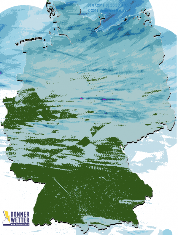 Größtenteils trocken blieb es hingegen südlich des Mains. Nur am Alpenrand fielen im Tagesverlauf ebenfalls ein paar Tropfen.