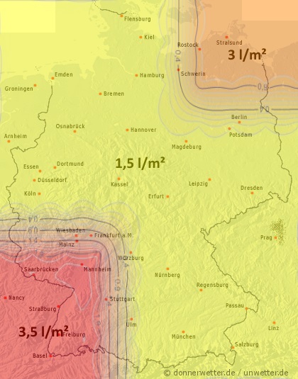 Lediglich in Teilen Niedersachsens und in einem Streifen von der Eifel und dem Niederrhein bis ins Erzgebirge und an den Bayrischen Wald kam es noch zu vereinzelten Schauern und Gewittern, die lokal auch kräftig ausfielen und mehr als 50 Millimeter Niederschlag in kurzer Zeit brachten.