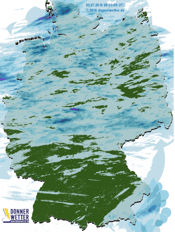 Südlich einer Linie Frankfurt am Main - Bayreuth blieb es hingegen vielerorts vollständig trocken. Lediglich im äußersten Südosten vom Bayrischen Wald bis ins Berchtesgadener Land fielen ebenfalls ein paar Tropfen.