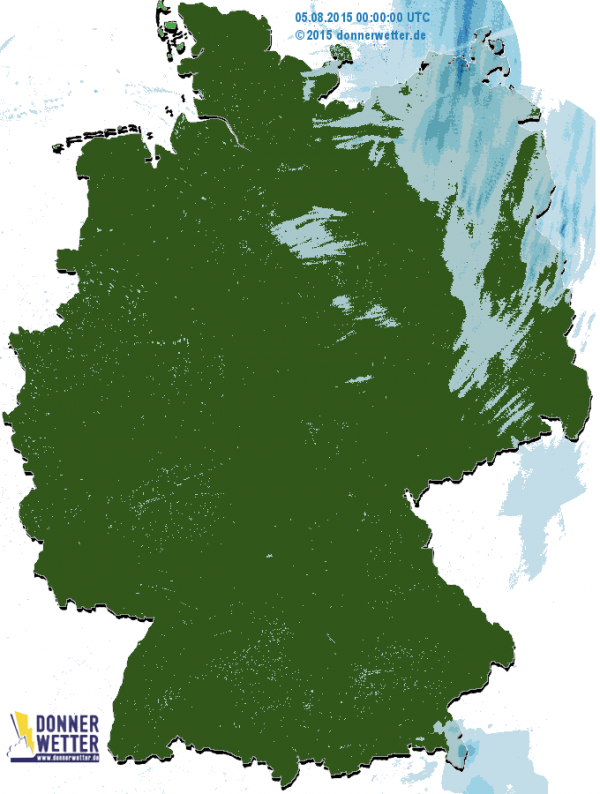 Leichte Schauer fielen gestern im äußersten Nordosten Deutschlands, etwa an der Ostseeküste und der Mecklenburgischen Seenplatte. Wenige Tropfen bekam zudem das Berechtesgadener Land ab.