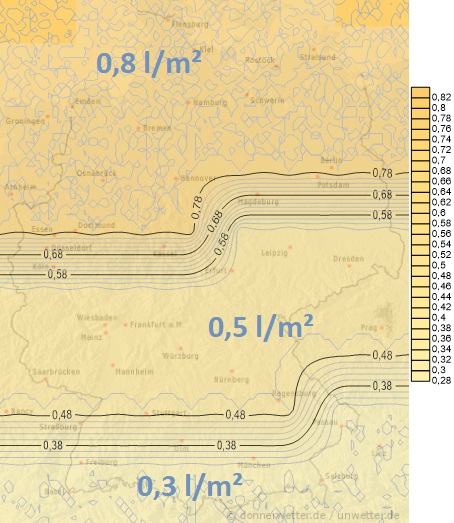 Heute fällt vor allem im südlichen Bayern zunächst leichter bis mäßiger Regen, sonst entwickeln sich mit sonniger Einstrahlung wieder örtliche Schauerwolken, vereinzelt auch mit Blitz und Donner. Die Niederschlagsmengen liegen dabei meist zwischen 1 und 10 Liter pro Quadratmeter. Regional bleibt es aber auch trocken.