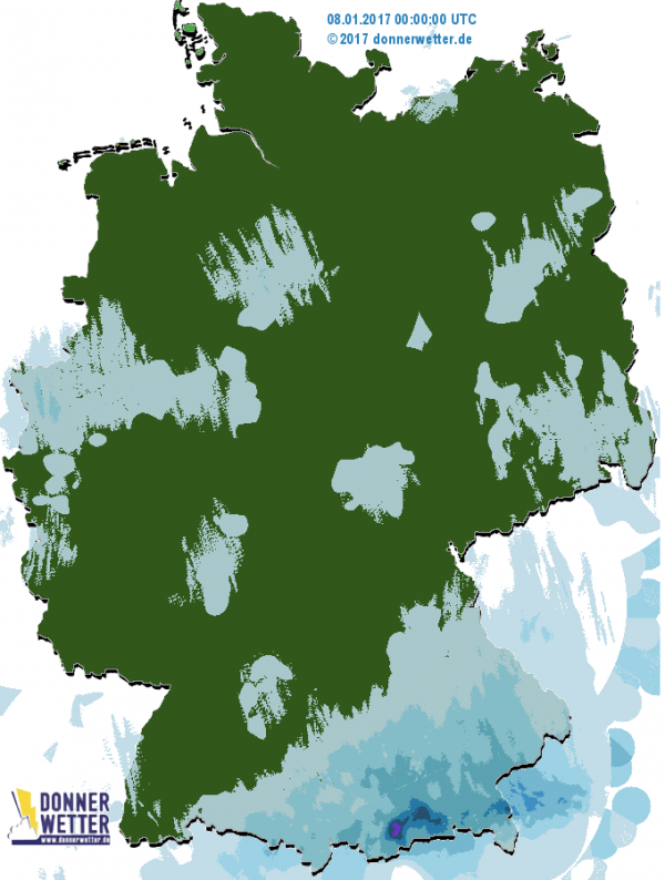 Am Sonntag blieb es in Deutschland weitgehend trocken. Es wurden kaum Niederschläge beobachtet. Allerdings schneite es in Bayern und insbesonder am Alpenrand etwas.