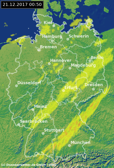 Heute zieht eine Niederschlagszone über die Mitte und den Süden. Bei leichter Milderung steigt die Schneefallgrenze auch in Bayern auf über 800 m. Die Niederschlagsmengen liegen dabei zwischen 5 und 15 Liter pro Quadratmeter. Ganz im Norden bleibt es eher trocken.