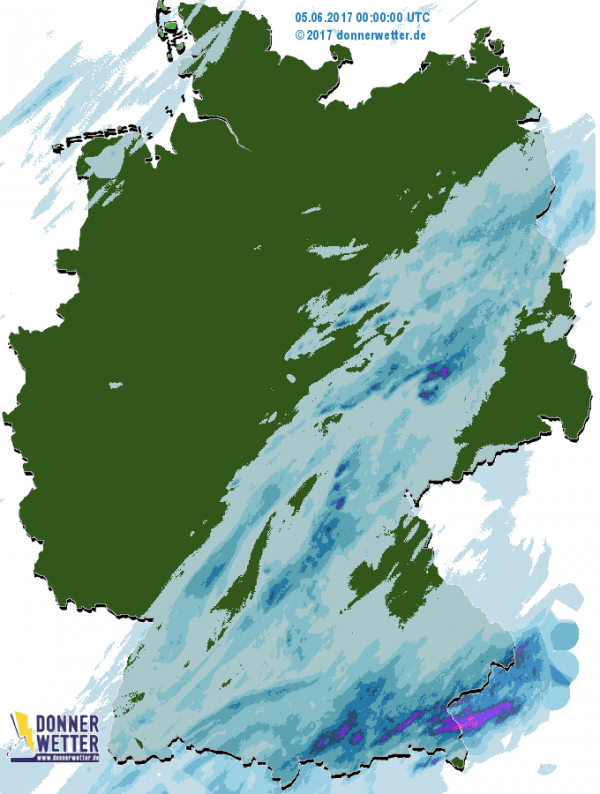 Das Radarbild zeigt aktuell noch einige schwache Schauersignale im Osten und im südlichen Bayern. Sonst ist der Himmel über Deutschland teils bewölkt, teils sternenklar. Im Süden haben sich vermehrt Nebelfelder gebildet.